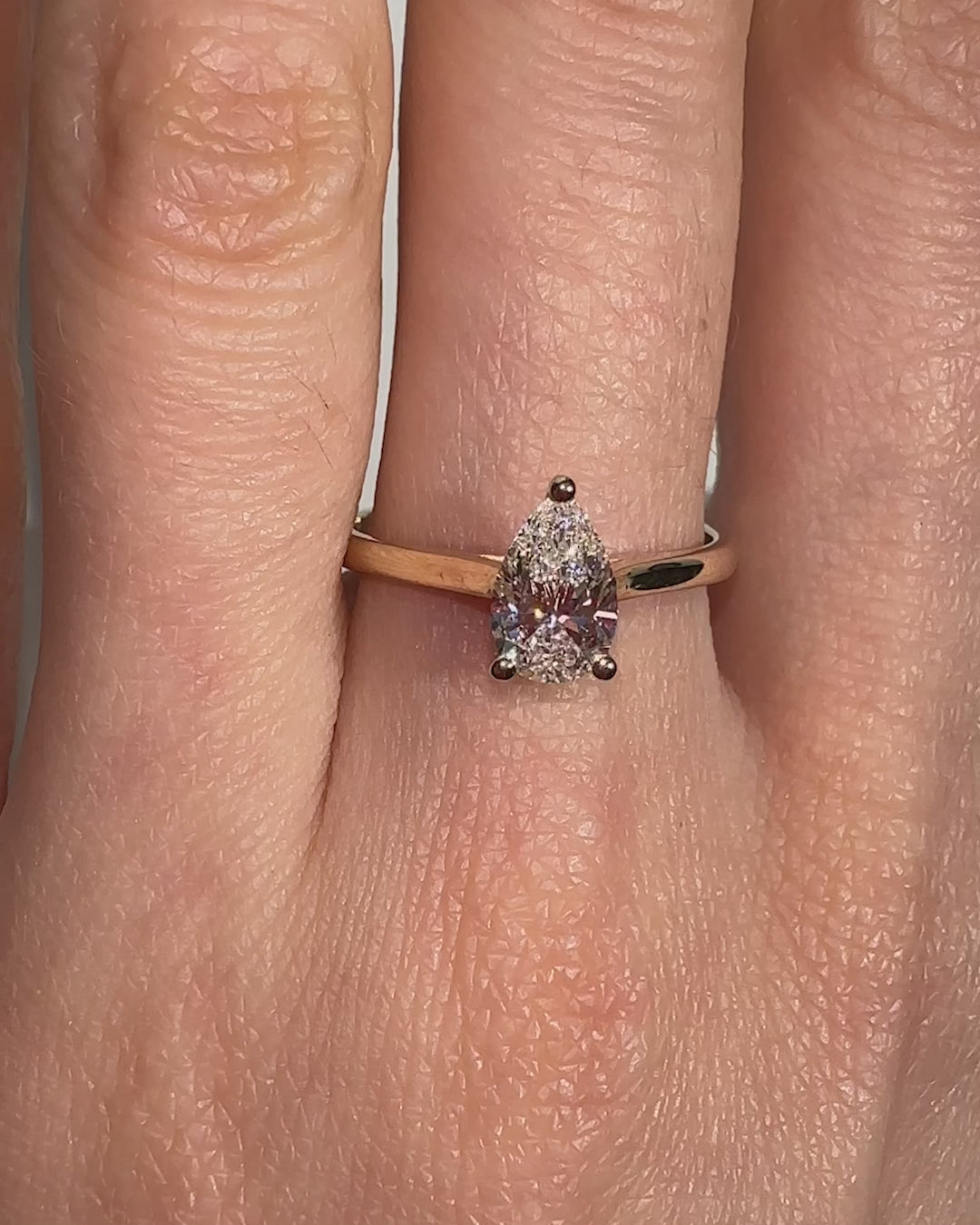 This ring features a pear cut lab grown diamond, delicately balanced between 3 round claws on a solid gold band. A classic solitaire engagement ring, handcrafted in our London workshop.