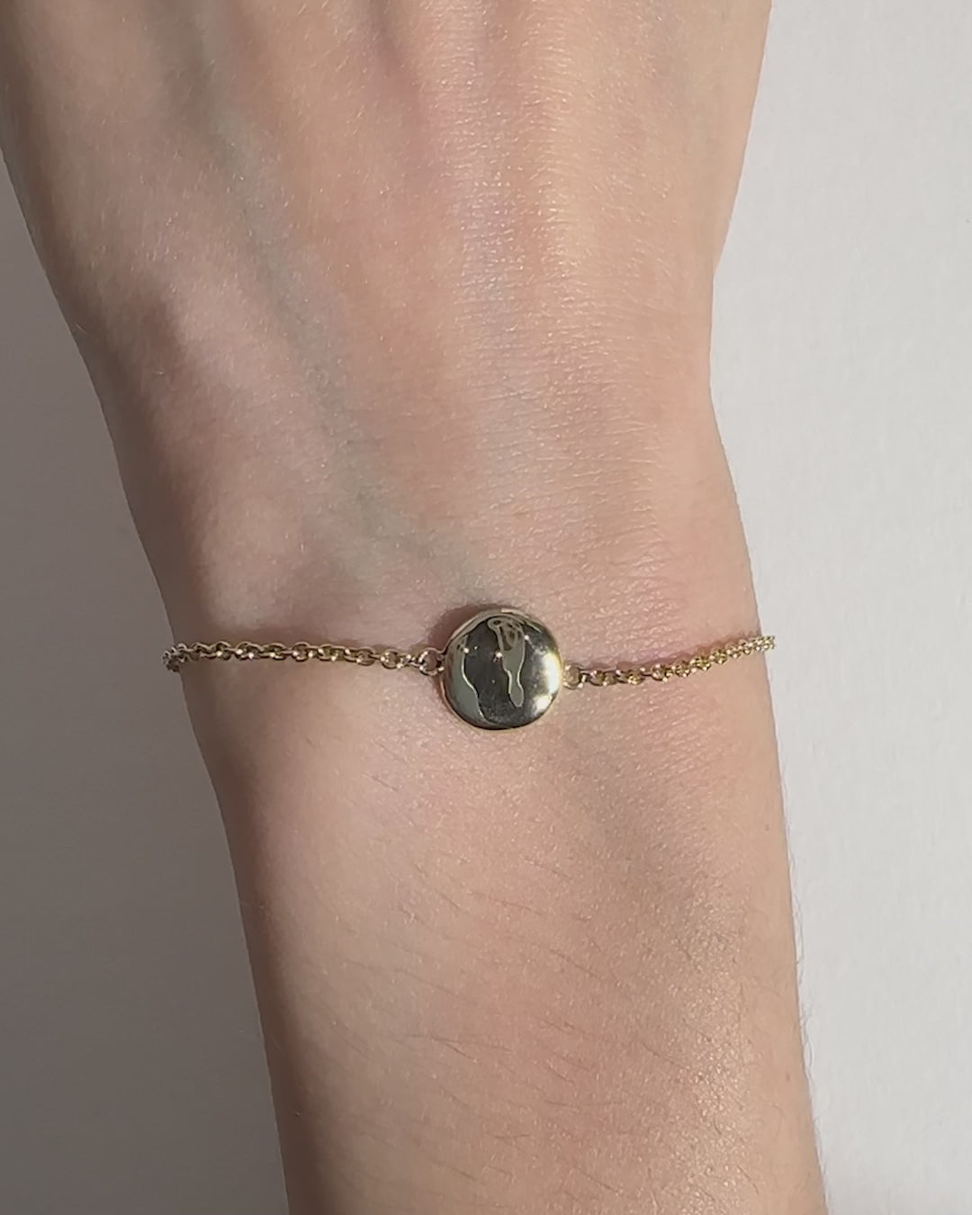 A delicate chain bracelet features a textured round charm, made for engraving. Handcrafted in our London studio with recycled 9ct solid gold, discover our Engravable Jewellery Collection.