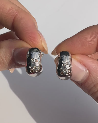 A celestial burst of sparkling white and champagne diamonds adorn these sculptural hoop earrings. Handcrafted in our London workshop with recycled solid gold and natural diamonds, discover our exclusive Celestial Collection.