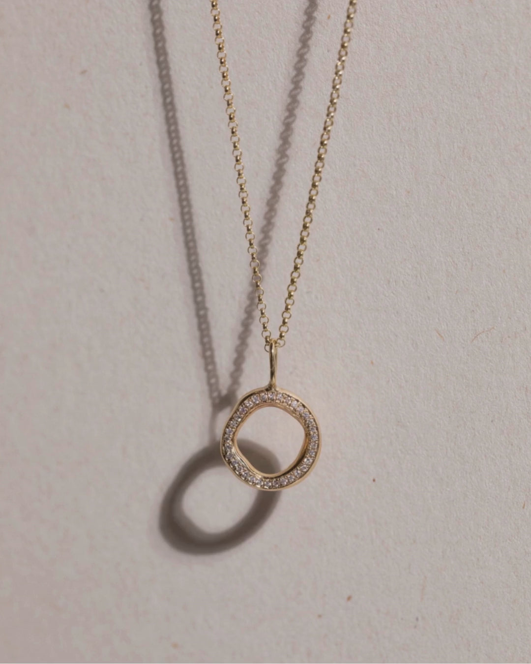 A hand-carved organic pendant sparkles with pavé set diamonds. Delicate yet bold in nature, this necklace is perfect when worn solo or as the centrepiece of your necklace stack. Finely crafted by skilled jewellers in our London studio with recycled 9ct solid gold and responsibly sourced gemstones. Discover the Pavé Helios Collection.