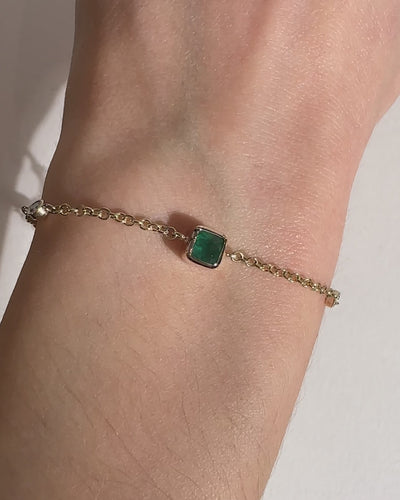 A vivid bezel set emerald adorns a delicate chain bracelet, alongside four sparkling lab grown diamonds. Handcrafted with recycled solid gold by our jewellers in our London workshop.