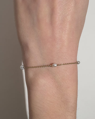 A delicate solid gold chain bracelet, adorned with luminous freshwater pearls. The perfect finishing touch for a modern bride, or an elegant bracelet for everyday wear. Discover our Pearl Collection.