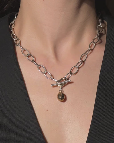 Handcrafted link by link in our London atelier, the Molten Chain Necklace is made with 100% recycled silver and a sculptural 9ct solid gold link in the centre. Created with Maya's signature organic shapes and a T-bar fastening, this mixed-metal necklace can also be paired with The Molten Drop Charm. Shop the Molten Collection.