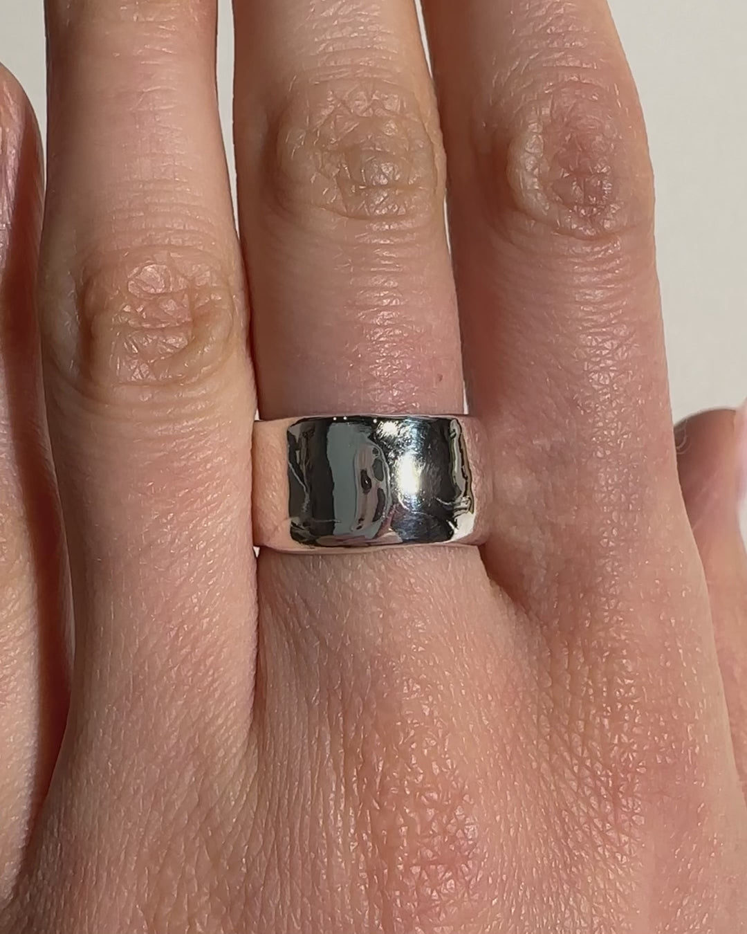 A fluid wide band has been hand-carved by our skilled jewellers to create a unique molten effect. This ring is handcrafted in our London atelier with 100% recycled sterling silver and is available in gender neutral sizes. Shop the Molten Collection.