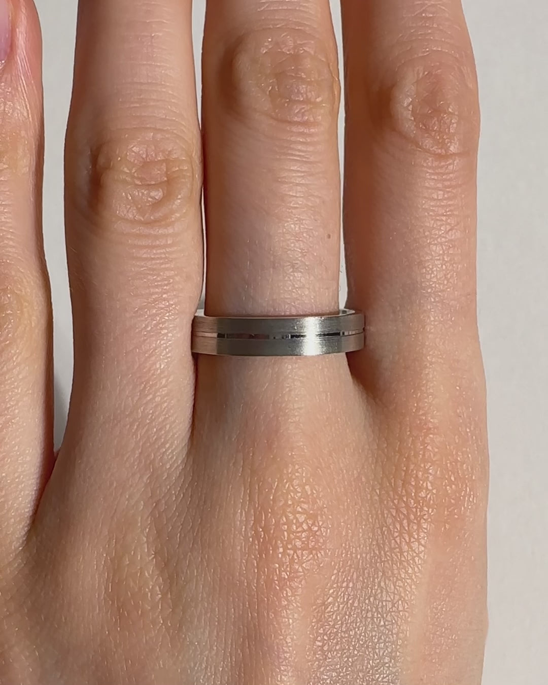 This 9ct solid white gold ring is both classic and contemporary. A slightly rounded inner adds comfort, whilst the smooth flat outer makes it easy to pair with other rings. A perfect wedding band choice, it sits comfortably with engagement rings. The modern matte finish and polished groove detail make it a timeless piece with an interesting detail.