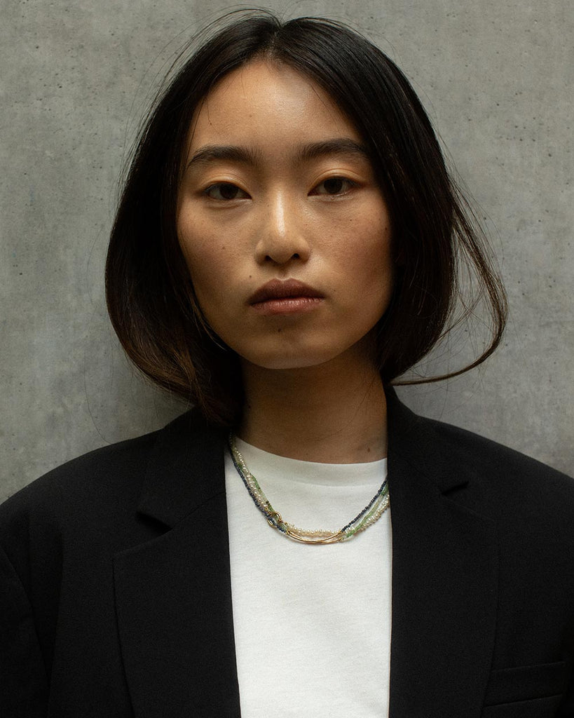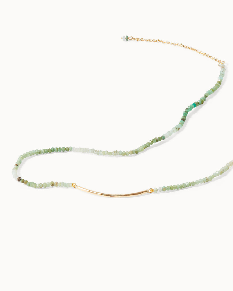 Faceted chrysoprase beads in soft shades of green are accented with a gently curved, hammered solid gold bar. Made to sit gracefully at the collarbone, this necklace adds the perfect pop of colour to complement your summer glow.
