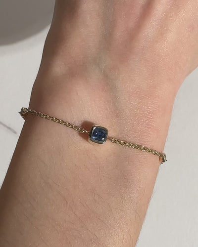 A delicate chain bracelet is adorned with a contemporary bezel set sapphire and four sparkling diamonds. Handcrafted by our jewellers with recycled solid gold and responsibly sourced gemstones.