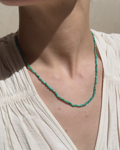 The perfect colourful compliment to your holiday glow. Faceted turquoise beads are hand strung along silk thread, and finished with a sterling silver clasp in our London workshop. Adjustable in length, this necklace is perfect for layering.