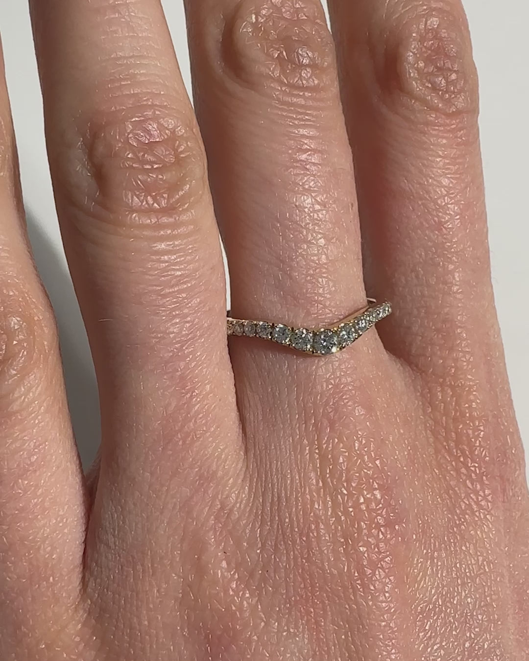 A solid gold wishbone band sparkles with pavé set diamonds. Crafted with a delicate sloping U shape, this wedding ring is made to stack perfectly with your one-of-a-kind engagement ring.