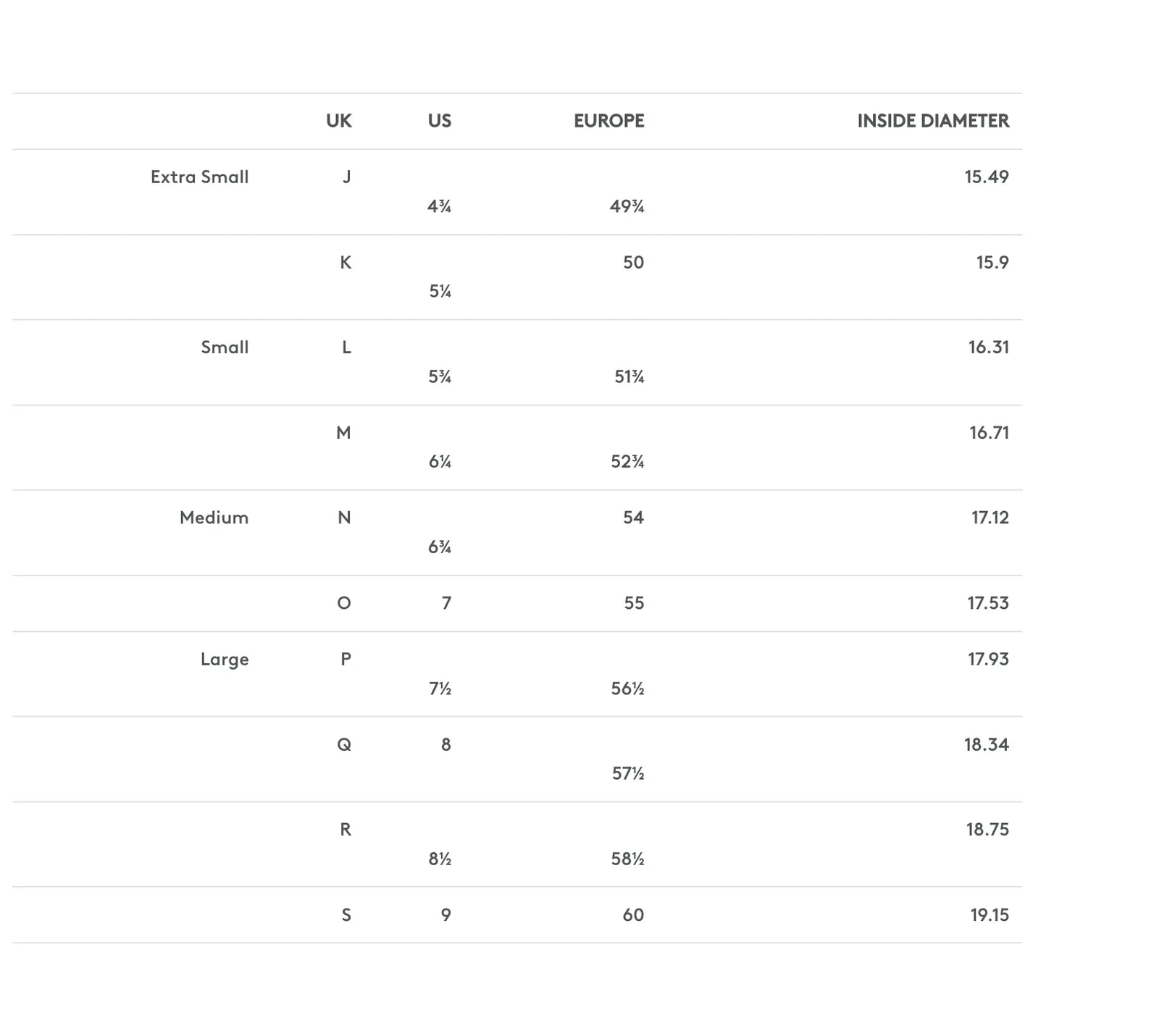 UK Ring Size Conversion Chart