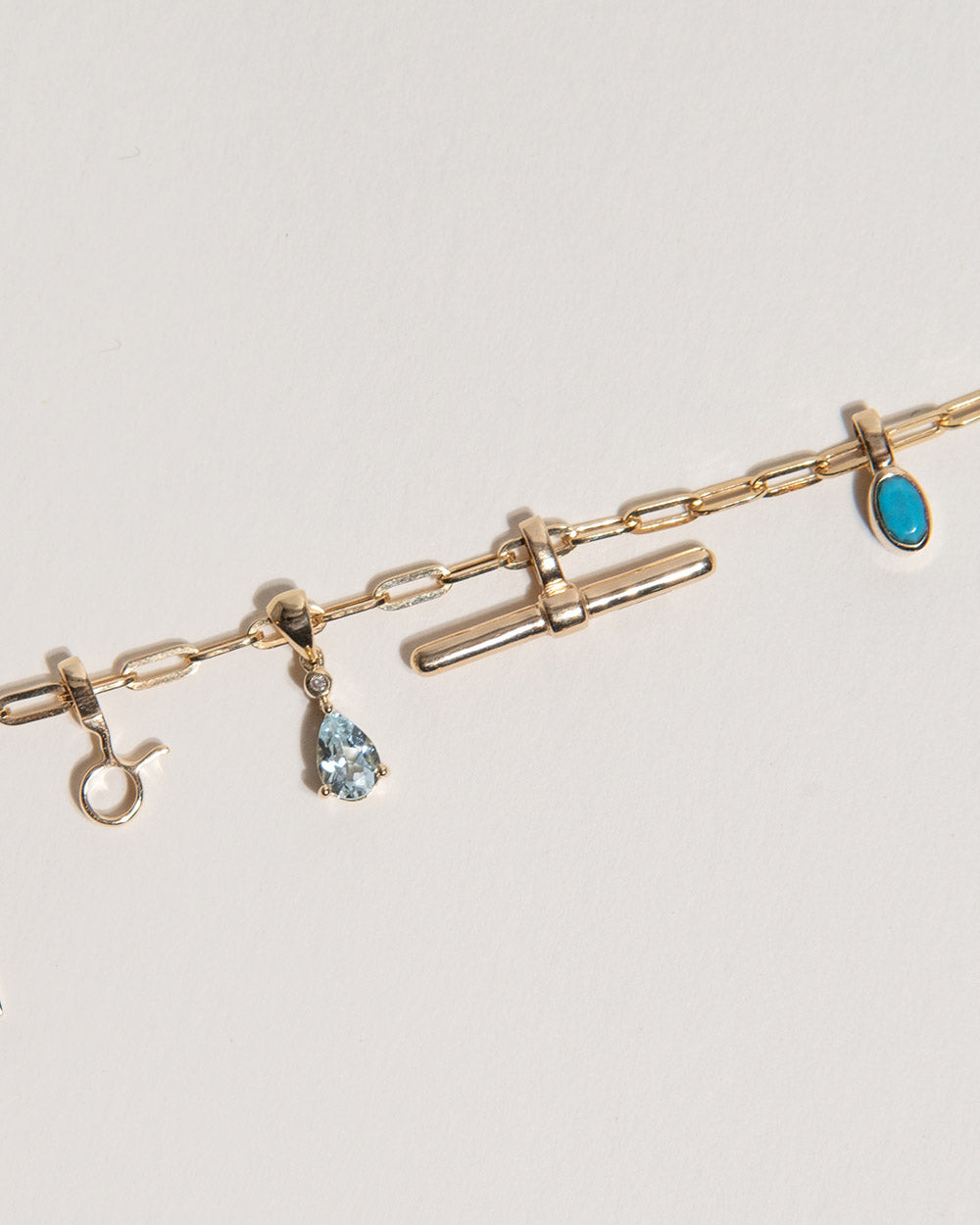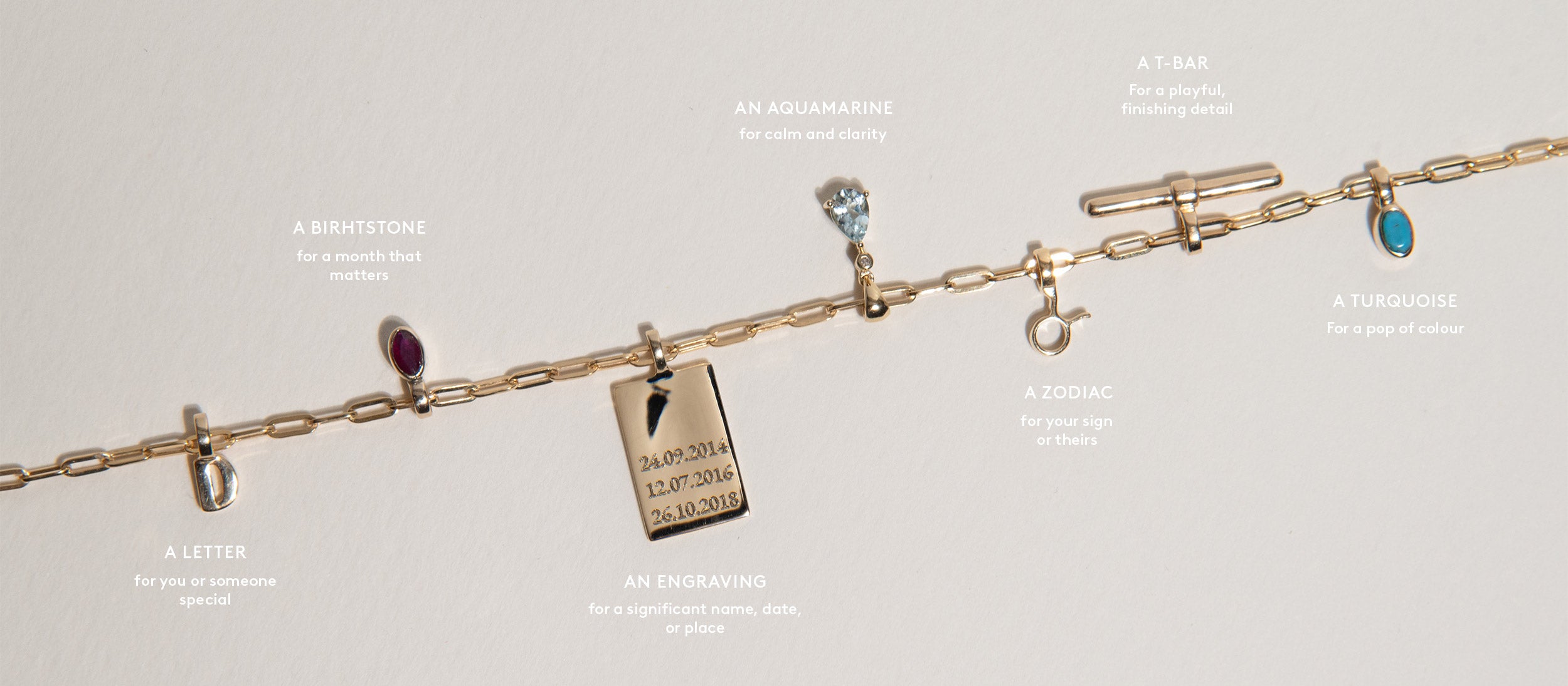 Charms are made to be added to over time. Start with the pieces that feel most like you now, then build as new moments come up - a new milestone, a new place, a new person. Add an extra initial, a birthstone to mark a date, or something lighter like a playful T-bar for texture and balance.