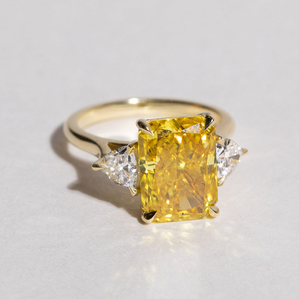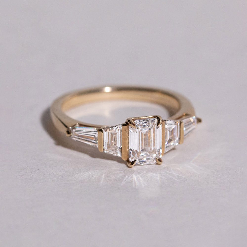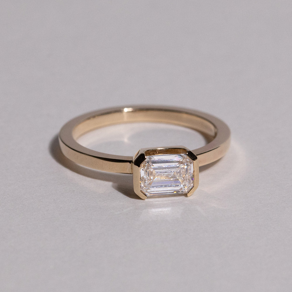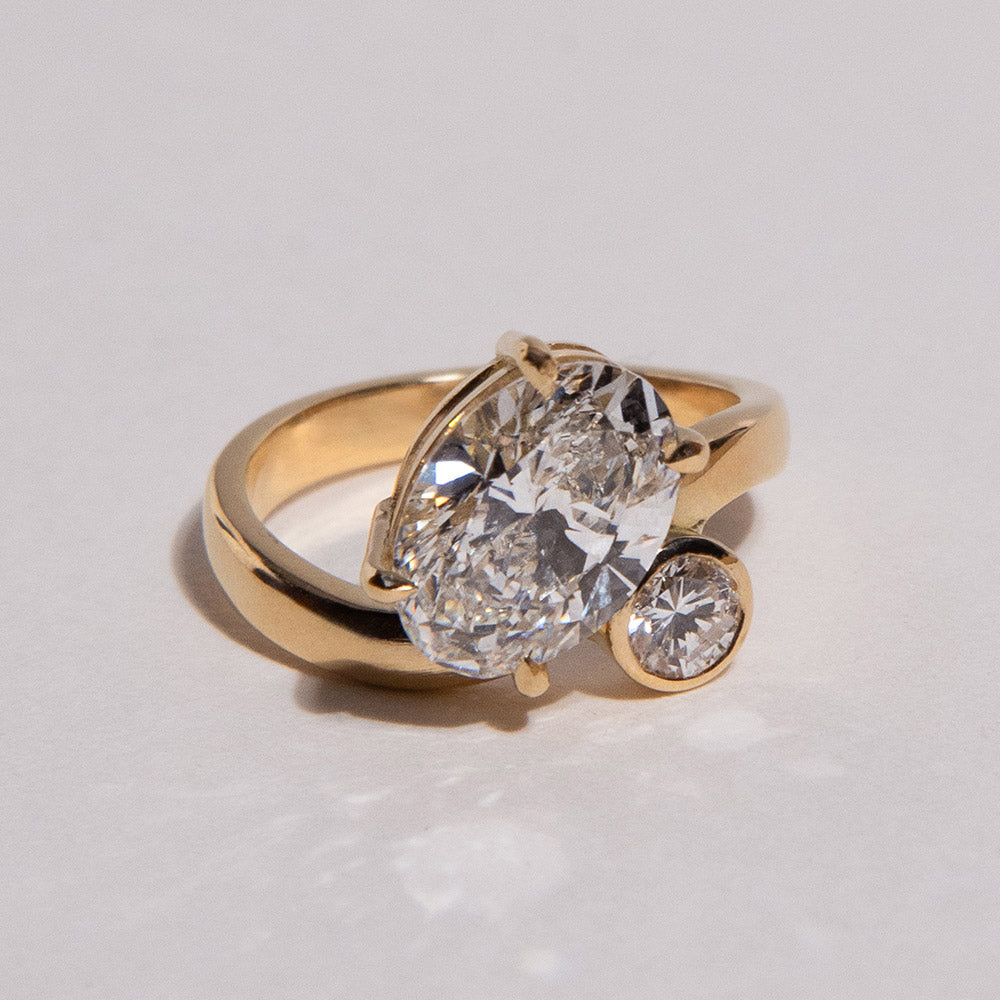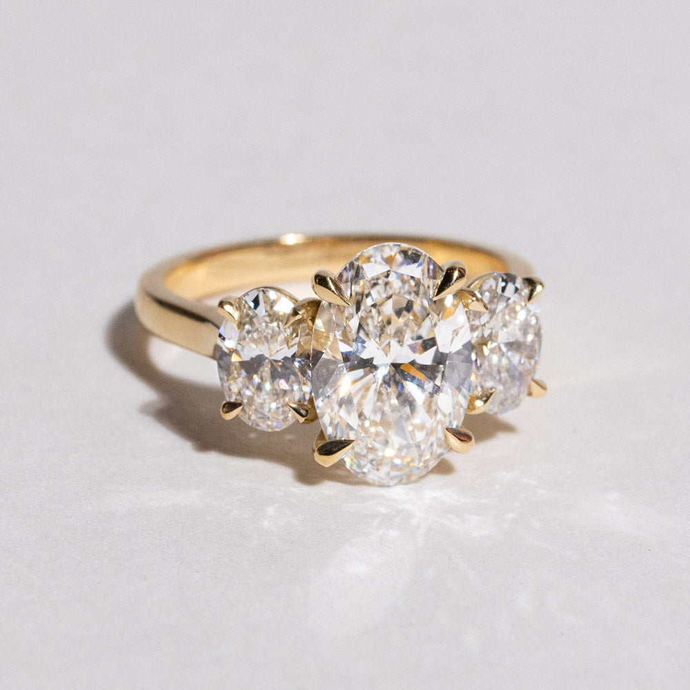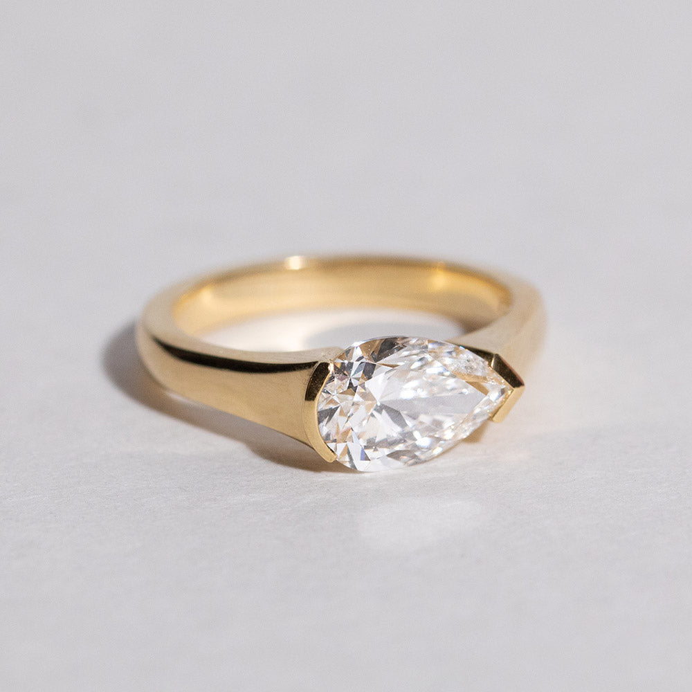 An oval, emerald or pear set horizontally for a quietly unexpected finish, often paired with clean, low-profile settings.