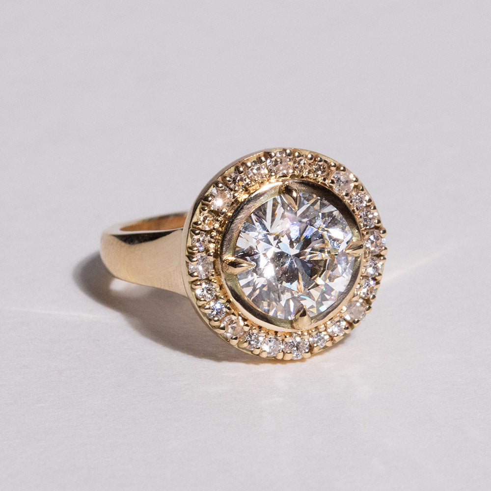 A centre stone finished with a fine diamond frame for extra light, kept clean and understated in proportion.