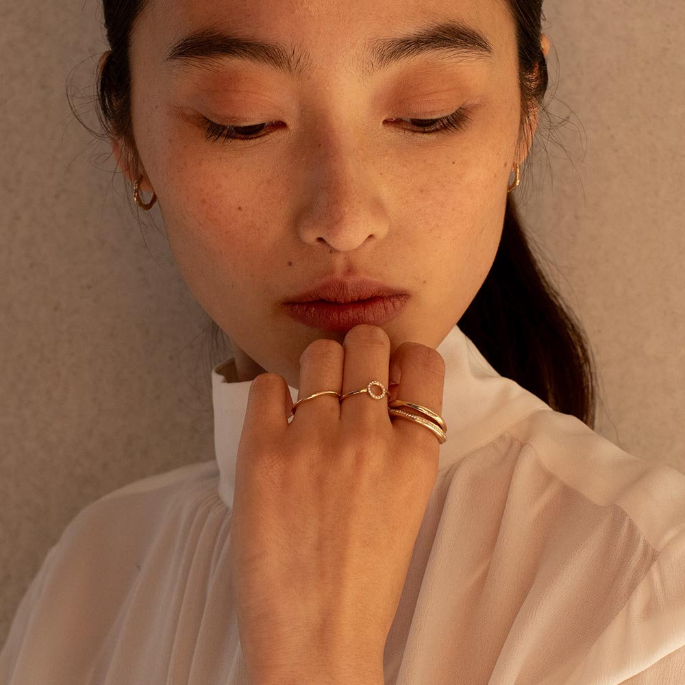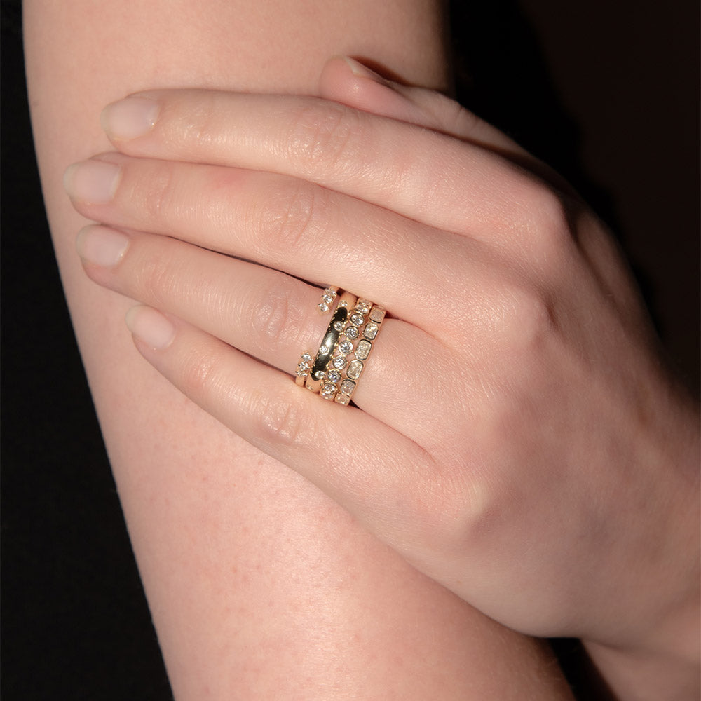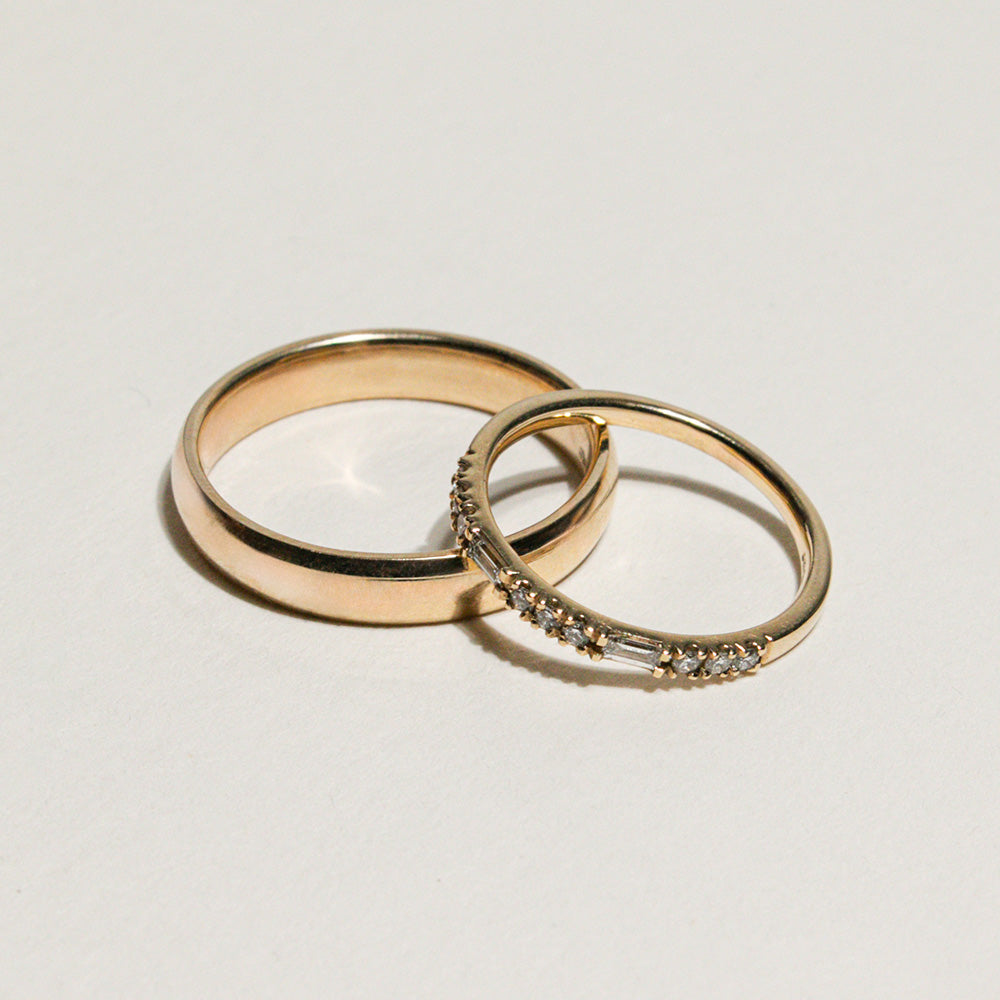 The band width can make a big difference to your stack - it shapes the overall balance, especially when worn alongside an engagement ring. A fine band feels understated and minimal. A mid-width band reads classic. A wider band has more presence - simple, but statement. Try a few proportions on your hand and choose what feels balanced, especially if you’ll wear it alongside an engagement ring.