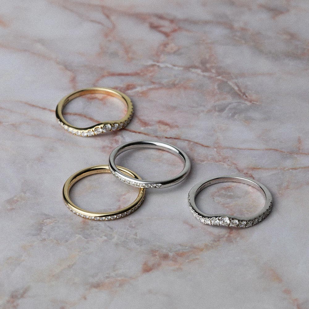 When stacking a wedding ring with your engagement ring, it’s worth considering metal choice for long-term wear. For the best durability, match the metal and gold carat - for example 9ct with 9ct, or 18ct with 18ct -as higher-carat gold is softer and can wear more quickly when paired with harder metals. Platinum is best worn with platinum.