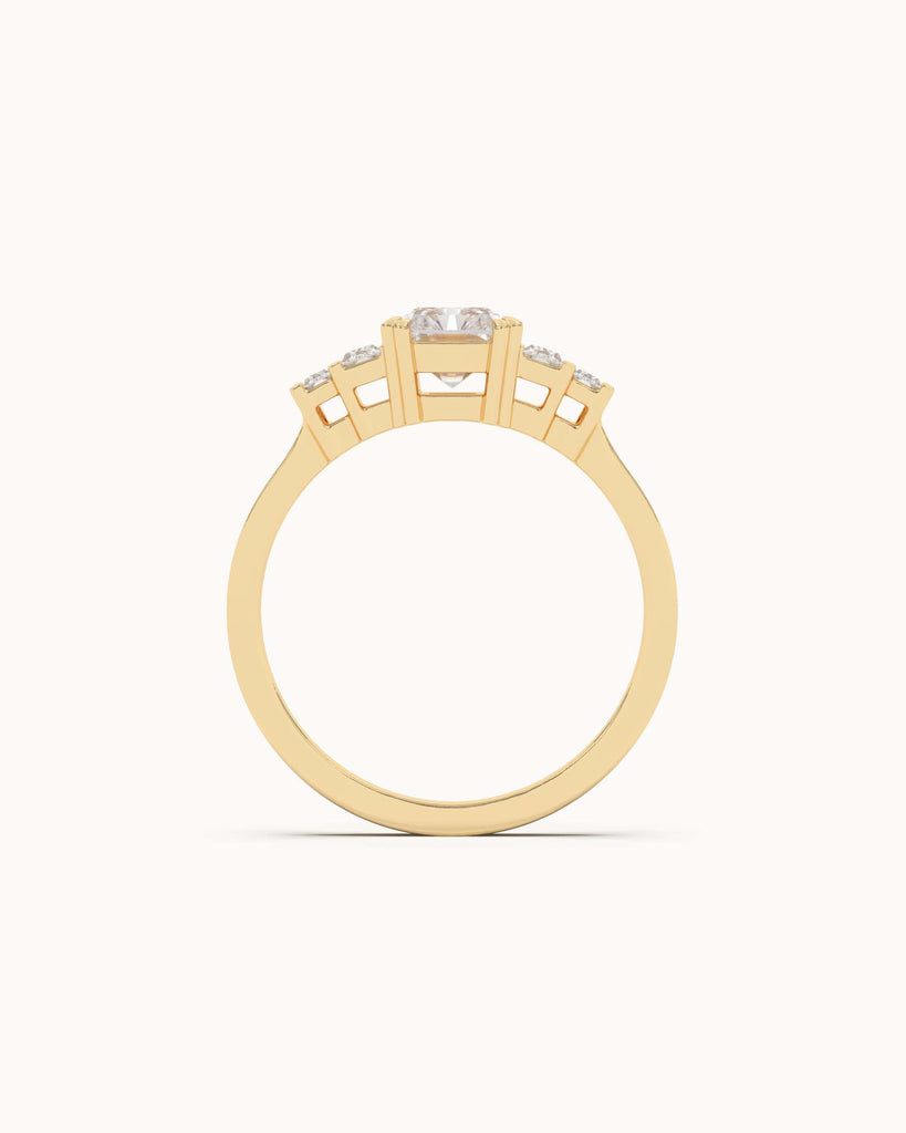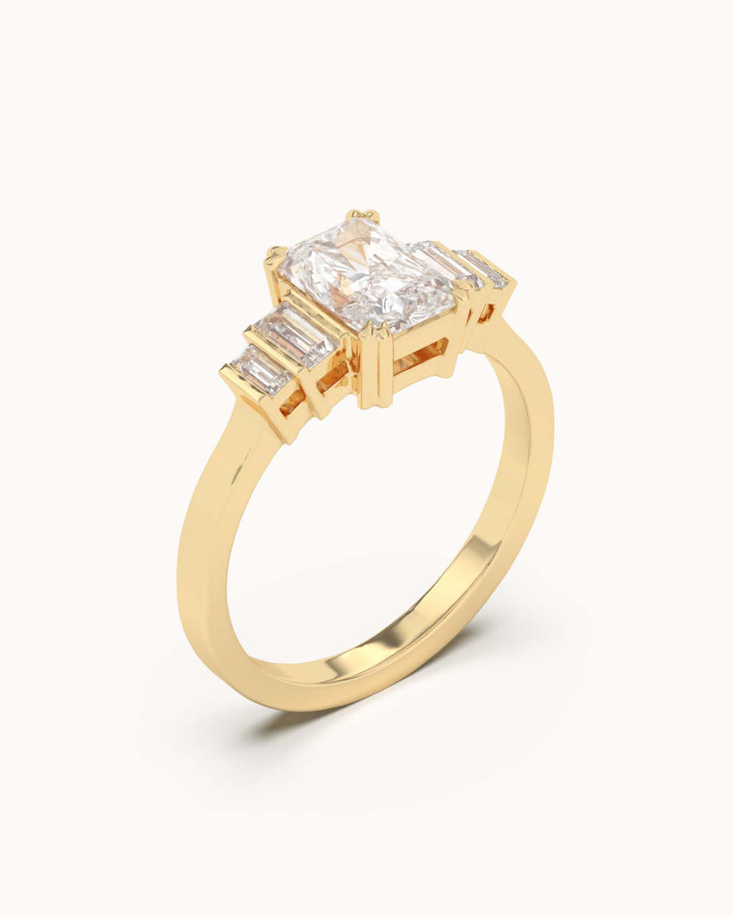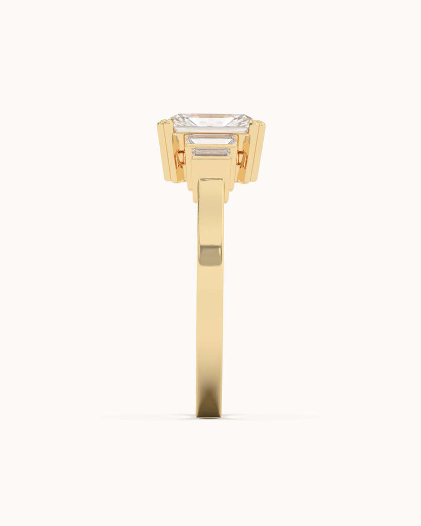 The geometric ring features an emerald-cut lab-grown diamond at the centre, with baguette-cut stones arranged on either side. Its clean lines and balanced design are inspired by architectural shapes. A timeless yet distinctive choice for a modern engagement ring.