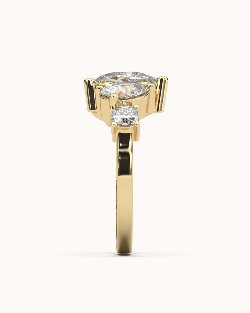 An asymmetric mix of pear, round, and oval lab grown diamonds arranged in a soft, clustered formation. Each stone is set finely set with subtle solid gold round claws, creating a gentle sense of movement and contrast within a clean, contemporary design. Handcrafted in London with recycled solid gold as a perfectly unique sustainable engagement ring.
