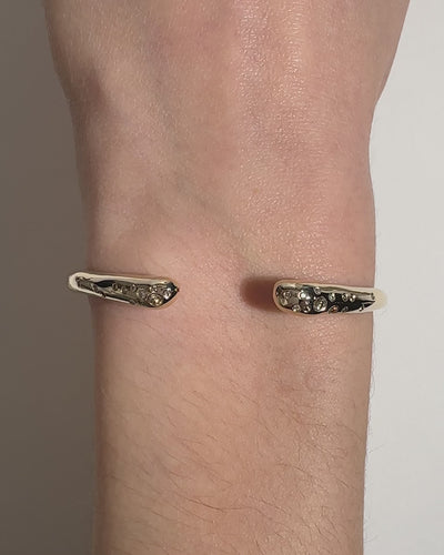 A hand-carved bangle is adorned with a sprinkling of finely set white and champagne diamonds. Handcrafted in London with recycled solid gold and natural diamonds, discover the limited edition Celestial Collection.