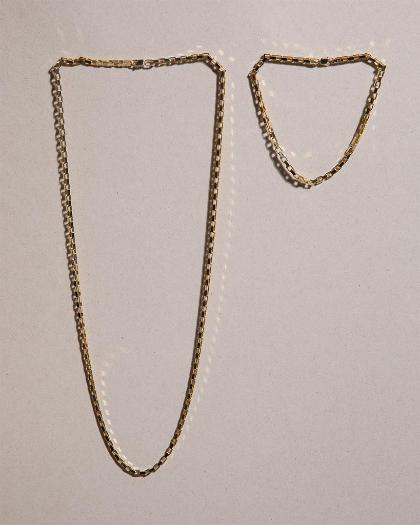 A contemporary solid gold jewellery set, featuring our Box Chain Necklace and Bracelet. Made for effortless styling, to elevate your everyday stack. Discover our Matching Sets.