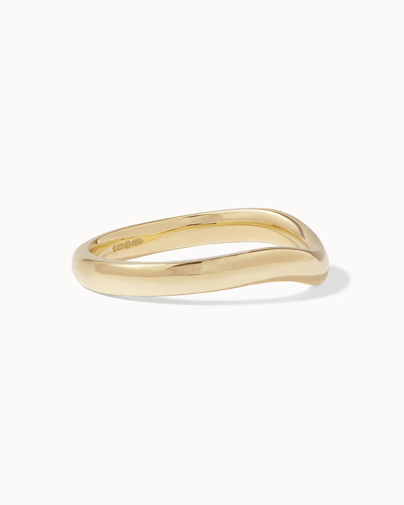 Crafted in solid gold, this minimalist curved band offers a modern twist on the classic gold wedding ring. Made to stack perfectly with a one-of-a-kind engagement ring.