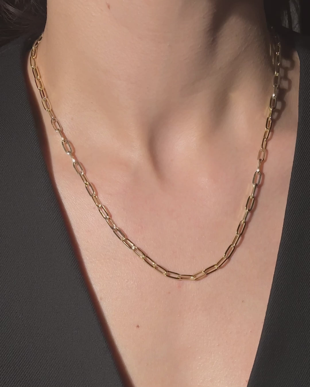 A bolder take on the classic paper chain, this necklace is crafted in 9ct solid gold. Perfect for everyday wear, it pairs beautifully with our Solid Gold Heavy Paper Chain Bracelet. An essential addition to any jewellery box.
