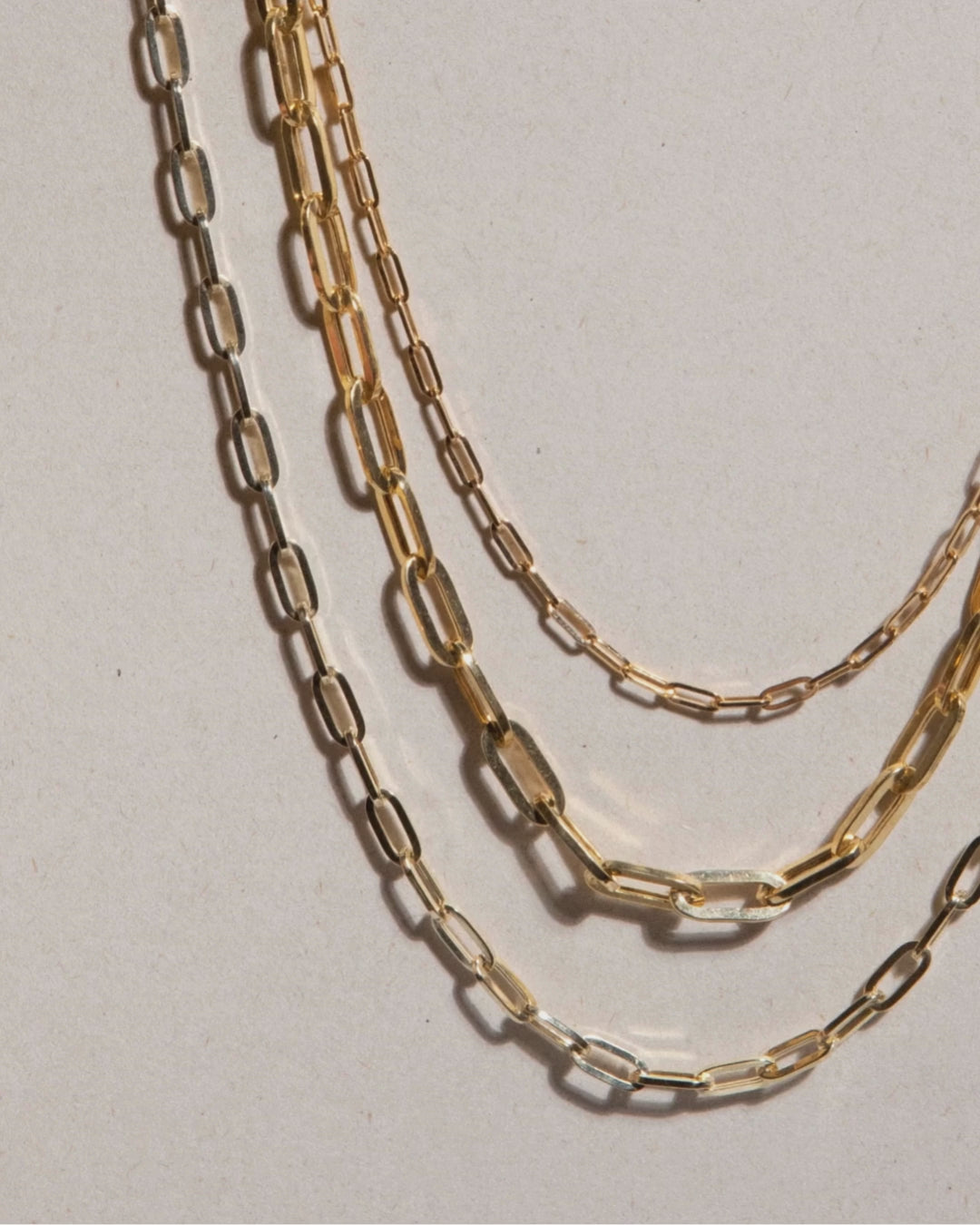 A bold necklace featuring oversized paper chain links, expertly crafted in 9ct solid gold. Designed to be the standout piece in your layered stack. Discover our Layering Chains.