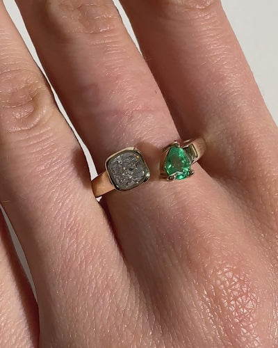 This toi et moi ring features a sparkling 0.36ct lab grown diamond and a vibrant pear cut emerald set in smooth recycled solid gold. Handcrafted with perfect balance by our jewellers in our London workshop.