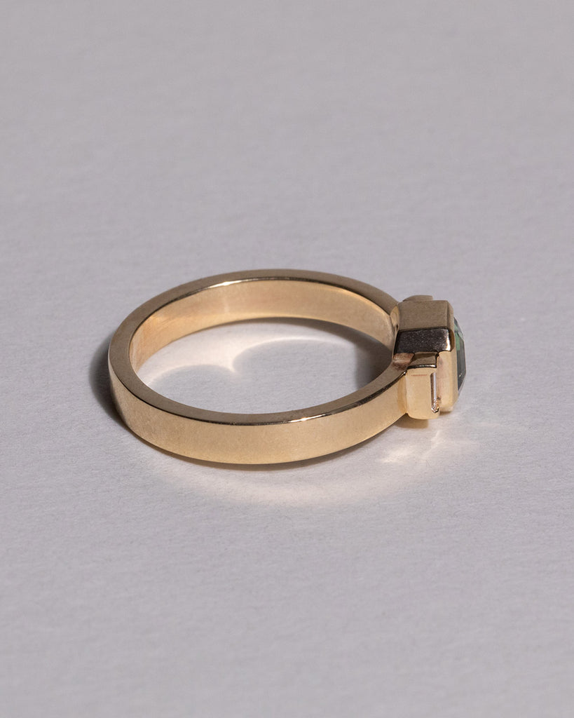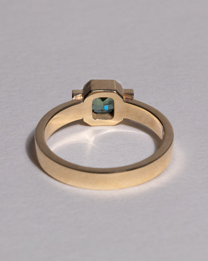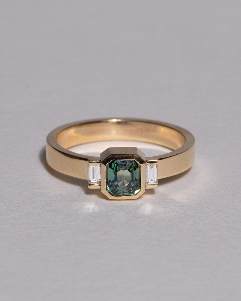 Leo is a one-of-a-kind ring with a 0.84ct octagon-cut green sapphire, framed by lab-grown baguette diamonds. Handcrafted in London from recycled 9ct gold, its bold flat band and bezel setting nod to Art Deco influences while keeping a clean, modern finish.