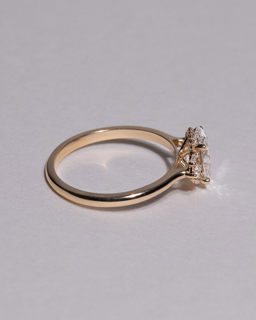 Margot is a one-of-a-kind engagement ring featuring a 1ct oval cut lab-grown diamond, flanked by six round cut diamonds for added brilliance. Handcrafted in our London workshop from recycled 9ct gold, it’s set in a classic claw setting for a refined, timeless silhouette.