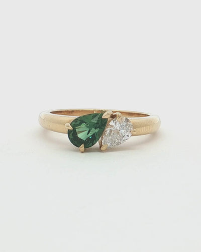 A vivid green sapphire meets a pear-cut white diamond in this one-of-a-kind toi et moi ring. Set in a sculptural talon claw setting, the two stones sit in quiet contrast - colour and light, depth and brilliance.