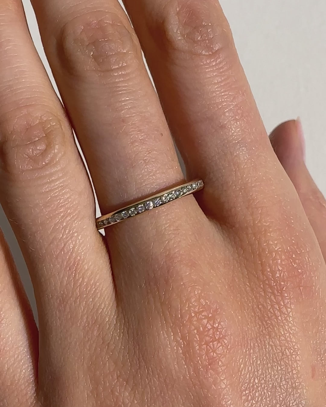 Surrounded by sparkling white diamonds, this solid gold eternity ring is crafted as a timeless wedding band, made to match with your one-of-a-kind engagement ring.
