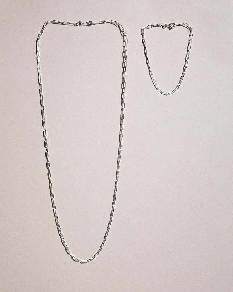 Our most-loved sterling silver paper chain necklace and bracelet, now available as a matching set. Made for effortless stacking and layering. Discover our Matching Sets.