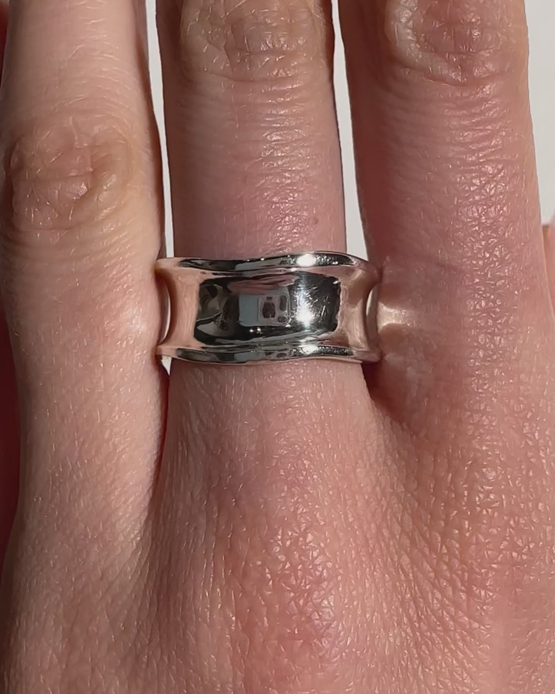 Hand-carved with a smooth sweeping curve, this organic wide band is a sculptural statement. Made in our London workshop with recycled sterling silver, this bold ring is perfect for wearing solo or pairing with its lighter counterpart. Discover the Ravine Collection.